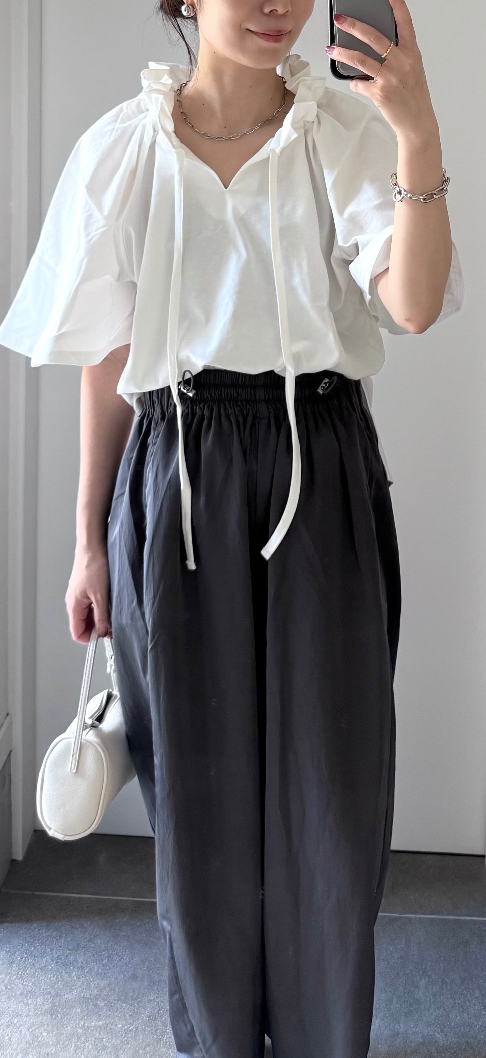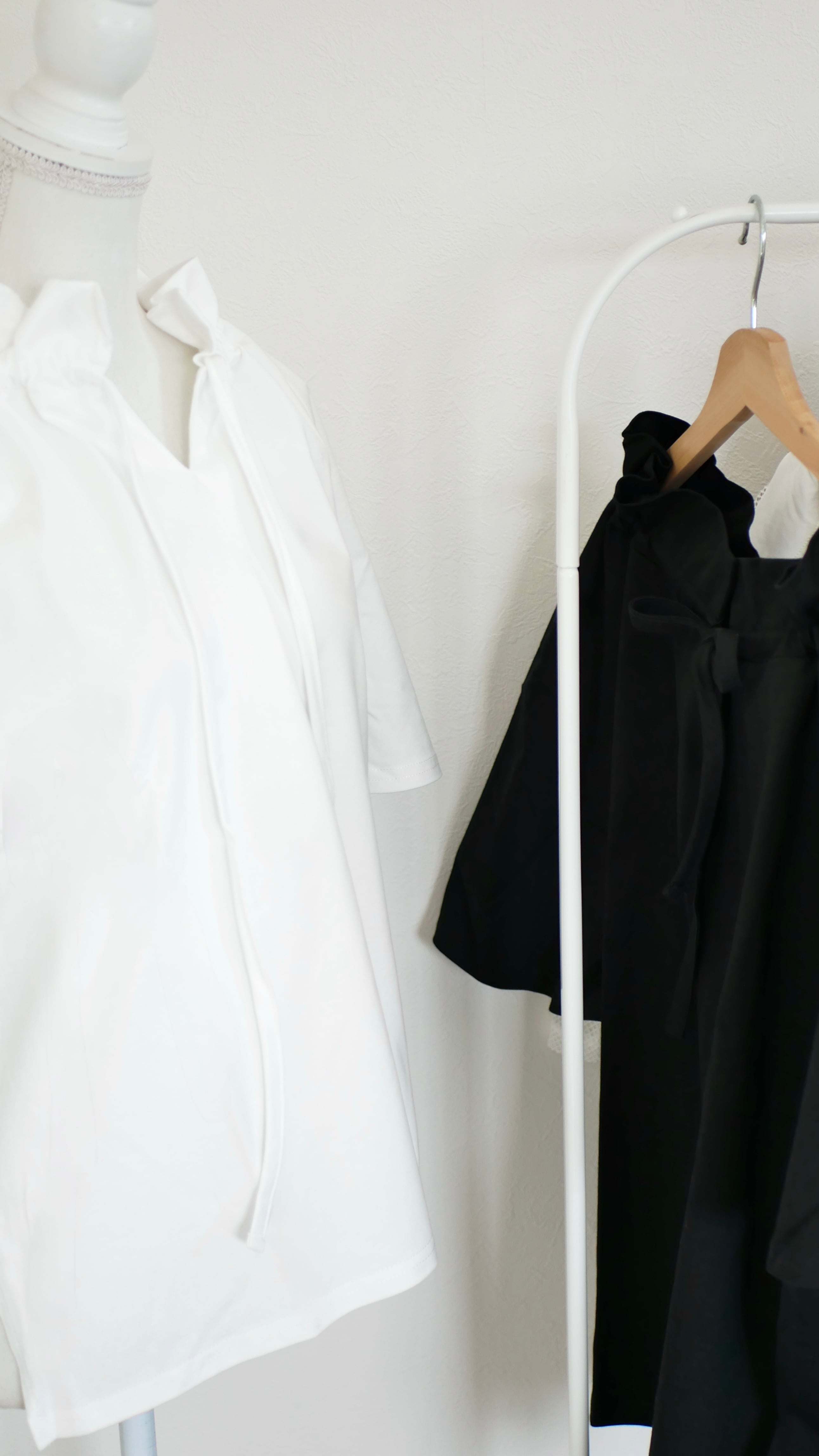 リボンで首元の開き具合やギャザー分量を
