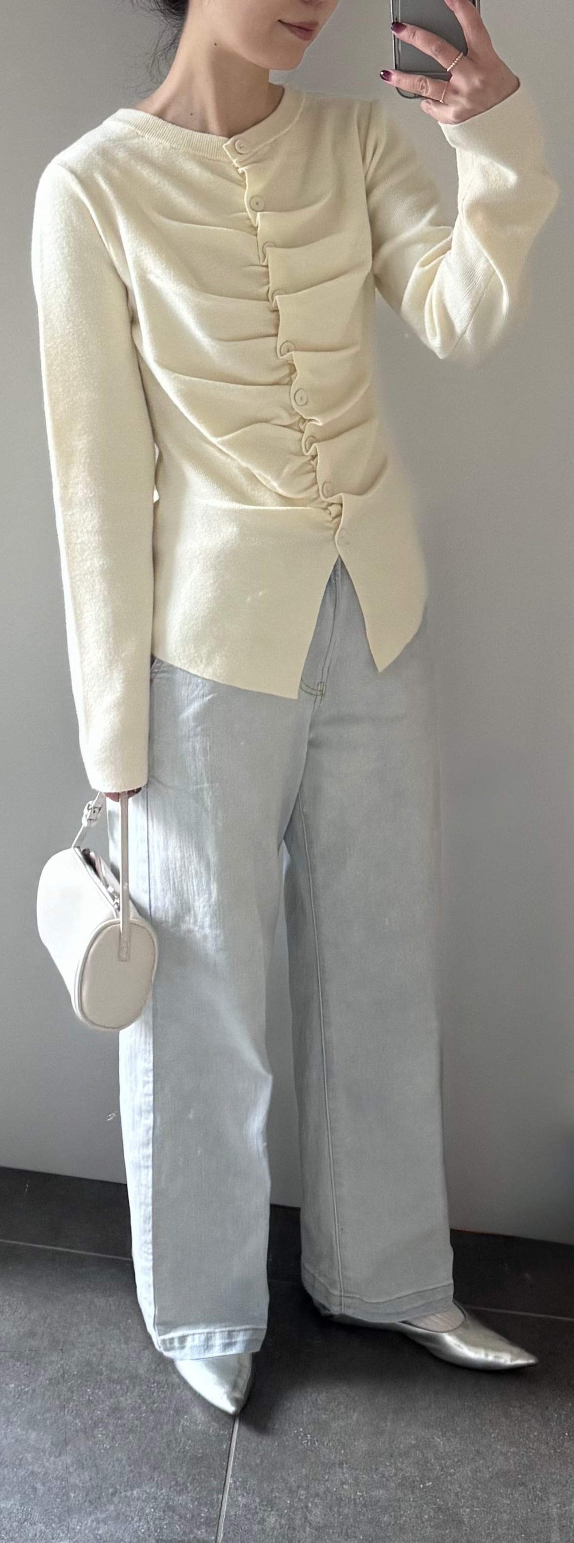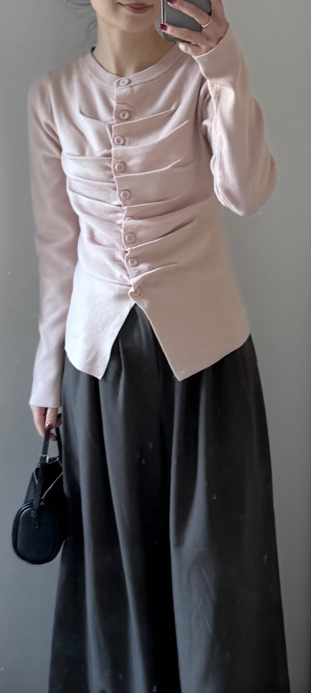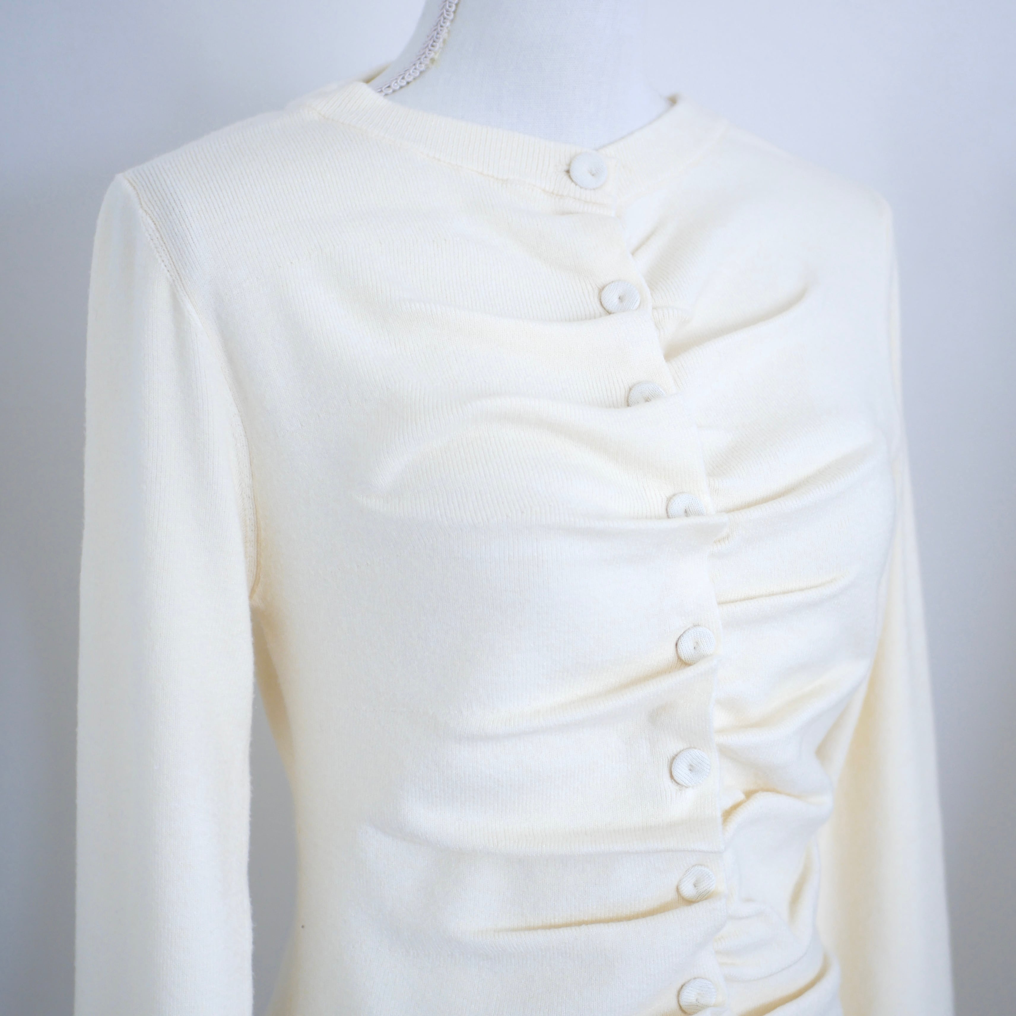 もちもちした、 肌触りの良いニット素材のカーディガン 前部分にギャザーを寄せたデザインが印象的 腰が隠れる長めの着丈 少しゆったりとしたサイズ感で 着心地も抜群です サイズ 着丈:59c 身巾:40c 肩幅:33.5c AH:21c 袖巾:14.5c 袖丈:64c 裾巾:39c 素材・: レーヨン:48% ポリエステル:29% ナイロン:23%