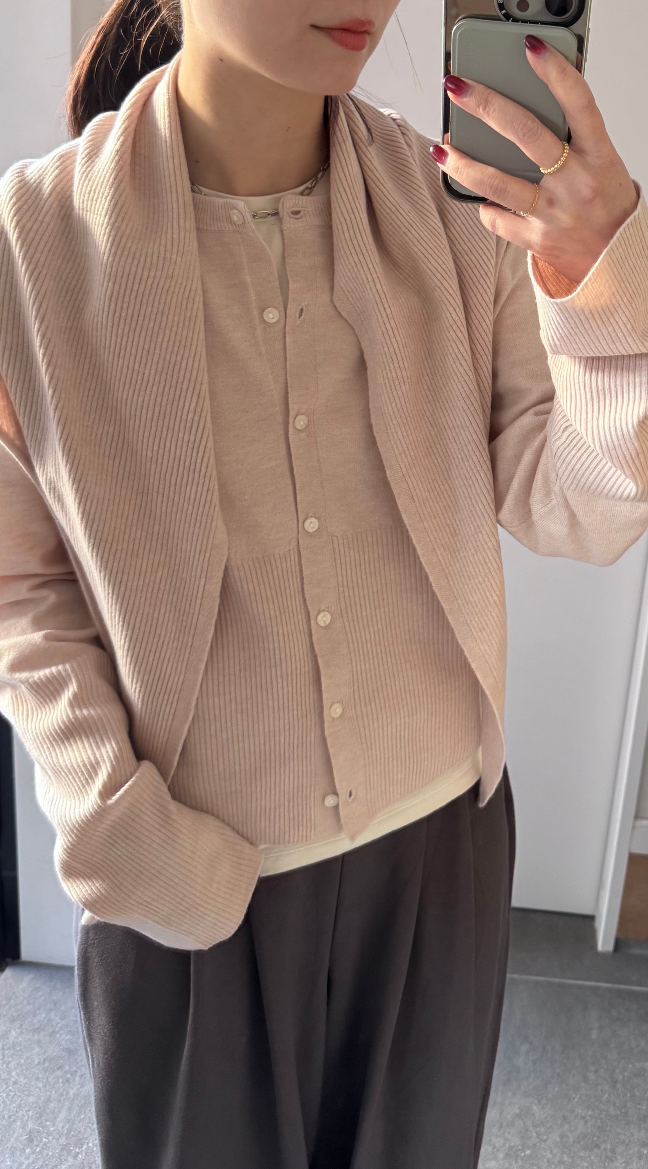 カーディガンにストールを無造作に巻くだけで、
